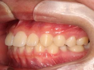 この様に顎の成長が足りない子が最近ではとても多く、この様なかみ合わせの子供は、下顎骨の発育が小さくて、上下の歯のかみ合わせがとても深く低い歯が特徴です。写真より、下の前歯が上の前歯に覆われてほとんど見えないと思いますが、これは上下の歯の高さが低い事を示しています。