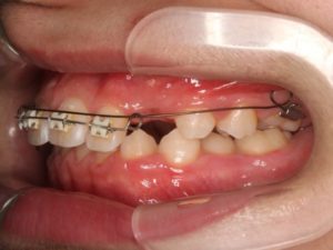 永久歯が生え始めた時期の検診の時に、奥歯が乳歯と重なり下から生えていました。このままだと永久歯が低い位置のまま成長が終わってしまう可能性がありました。これは下顎骨の成長が足りない為、奥歯の生えるスペースが歯列内に無い事で、この様な歯並びになっています。このまま大人になると、かなり治すのが難しい不正咬合になります。
