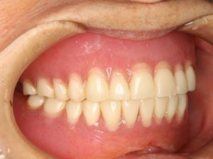 上下顎の義歯を嵌めるとこの様に、お口の中でピッタリフィットしています。かみ合わせも上下顎でピッタリ合っています。治療後は嘔吐反射が出る事はなく、就寝時も含めてご使用いただいています。