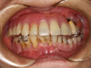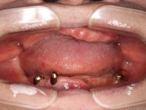 お口の中が安定して、歯も歯肉もキレイに治ると、この様なお口の状態になります。残っている歯には内冠と呼ばれるテレスコープ義歯に合わせた被せ物が合着してあります。